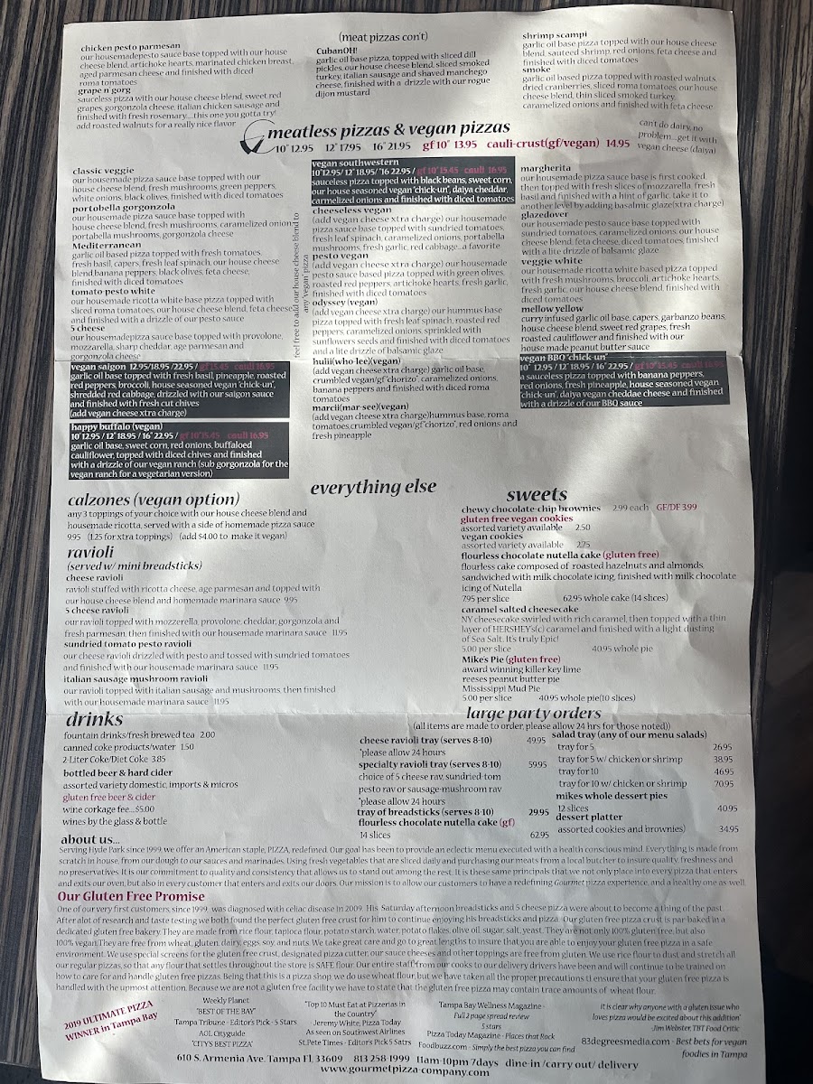 Sauceless pizza with our house cheese blend, green peppers, roasted red peppers, grilled chicken breast, red cabbage, and crushed peanuts finished with a Thai peanut sauce (add pineapple for a bit of sweetness)