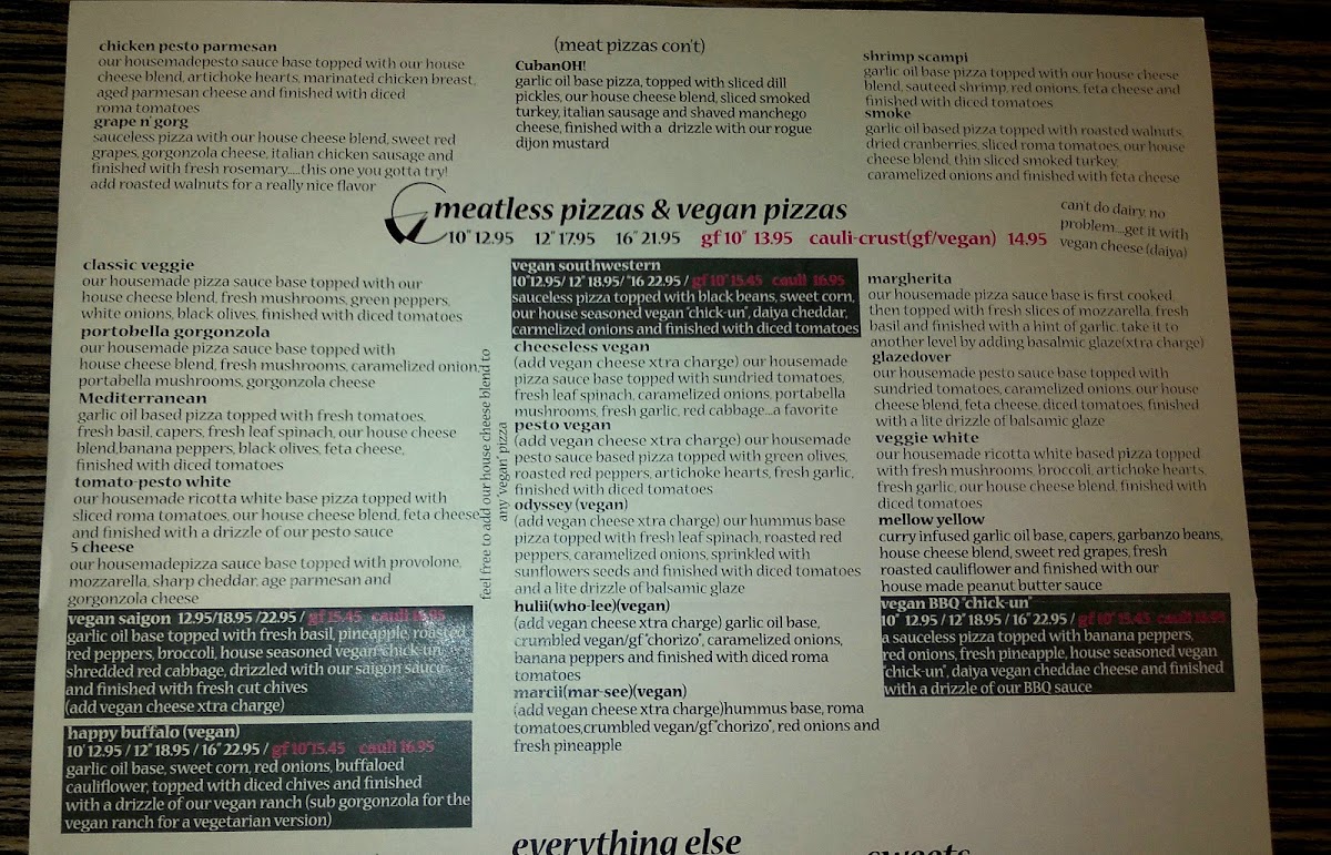 Our housemade pizza sauce base topped with our house cheese blend, fresh mushrooms, green peppers, white onions, and black olives finished with diced tomatoes